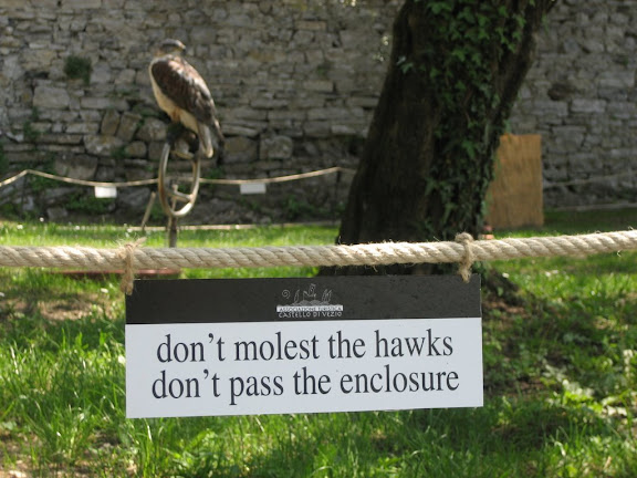 18th century buildings before heading up the steep hillside to a castle ruin for lunch. The views from the castle were the best we had ever seen. For some reason there were some hawks and an Owl kept there, perhaps it was a medieval thing. The sign outside the ropes was a little disturbing though, we wondering what type of tourists they had had trouble with in the past. We climbed some old